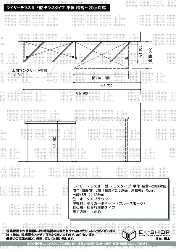 | サイズ | 屋根幅 2,750mm 出幅 1,485mm |
