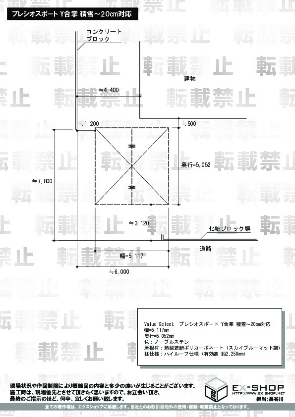 弊社は日頃から、迅速な対応とともに、全てのお客様に安心してご利用頂ける丁寧な対応を心掛けておりますので、このようなお褒めのお言葉を頂き、感無量でございます。Y合掌タイプのプレシオスポートが、敷地にぴったりと納まり、素敵な仕上がりでございますね。熱線遮断ポリカーボネート(スカイブルーマット調)の屋根材を使用しておられますので、暑い日差しを受け、高温になるカーポート下のスペースも、快適な温度に保ち、安心してお車を駐車して頂けるものと存じます。今後も、常に、お客様のご希望にかなった完成を目指し、努力して参ります。また機会がございましたら、是非エクスショップにご用命くださいますよう、宜しくお願い致します。