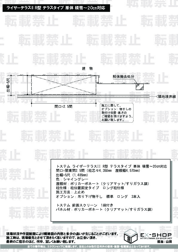 サイズ | 屋根幅 4,570mm 出幅 1,485mm |