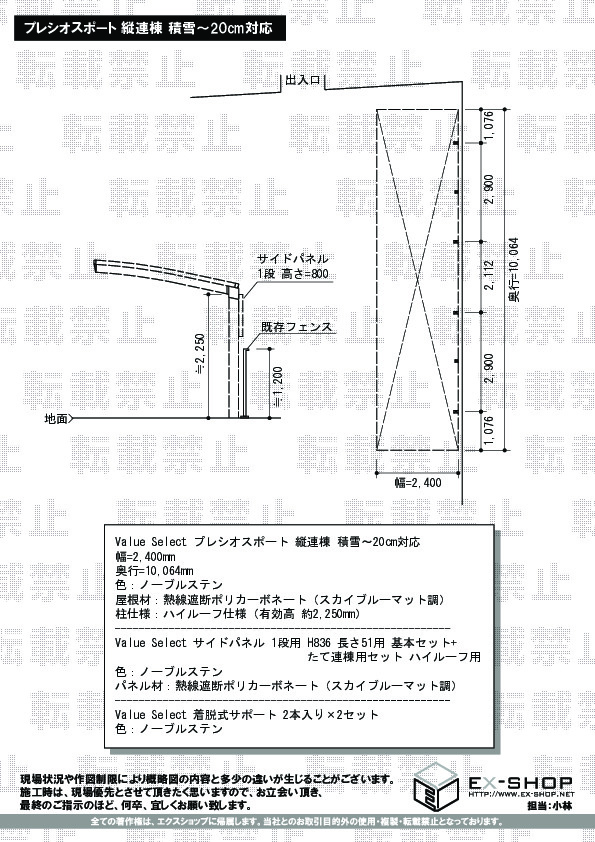 奥行10,064mm・ハイルーフ仕様と大変広々とした縦連棟タイプのプレシオスポートがしっかりと施工出来ましたこと、大変嬉しく存じます。お気に召して頂き、永く愛用して頂けましたら幸いでございます。また、お客様により見やすい・分かり易いホームページを目指し、日々自社で開発を行っておりますので、このようなお言葉を頂き、大変嬉しく存じます。これからも、お客様のご期待を裏切らないよう精進して参りますので、また機会がございましたら、ぜひエクスショップをご利用頂けますよう、宜しくお願い致します。