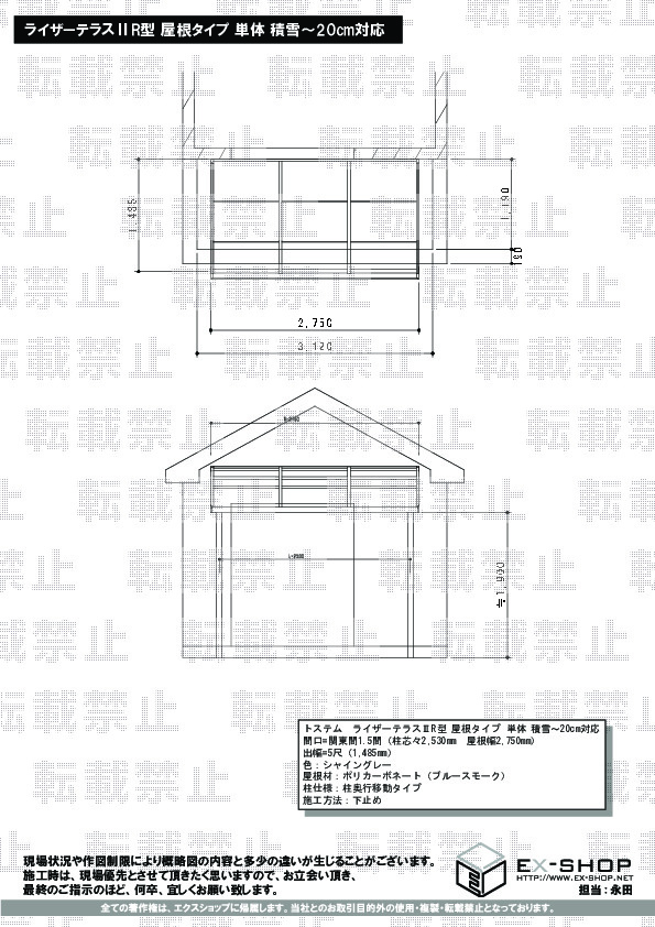 | サイズ | 屋根幅 2,750mm 出幅 1,485mm |