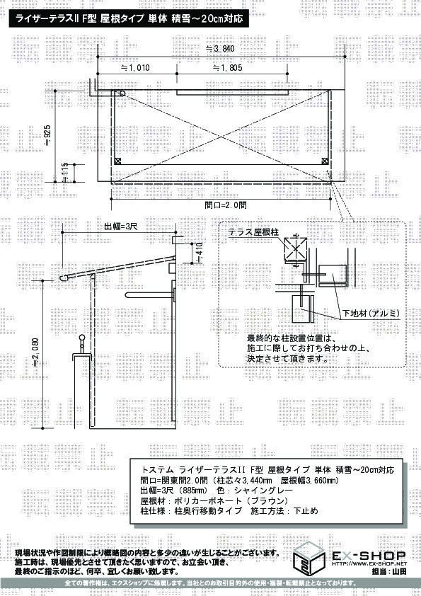 | サイズ | 屋根幅 3,660mm 出幅 885mm |