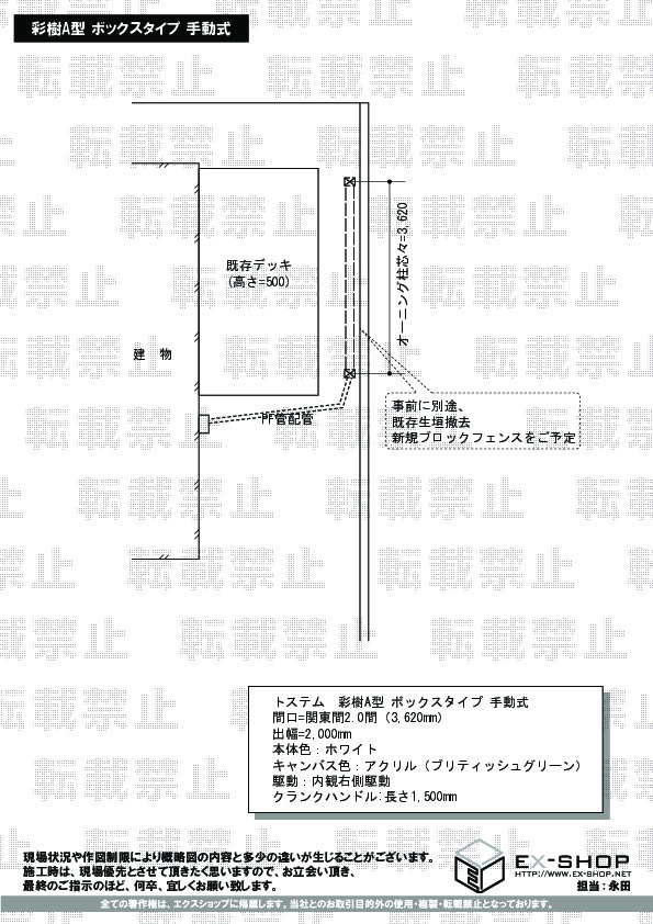 この度は、彩樹A型の施工をご依頼頂きまして、誠に有難うございます。二色使いのお洒落なフェンスと、ブリティッシュグリーンの屋根材がよくマッチして、綺麗な納まり具合でございますね。担当致しました施工士にお褒めのお言葉を頂き、施工士にとりましても何よりの励みになっております。弊社では、オーニング以外にも、様々なエクステリアをご用意致しておりますので、また、機会がございましたら、エクスショップにご用命くださいますよう宜しくお願い致します。