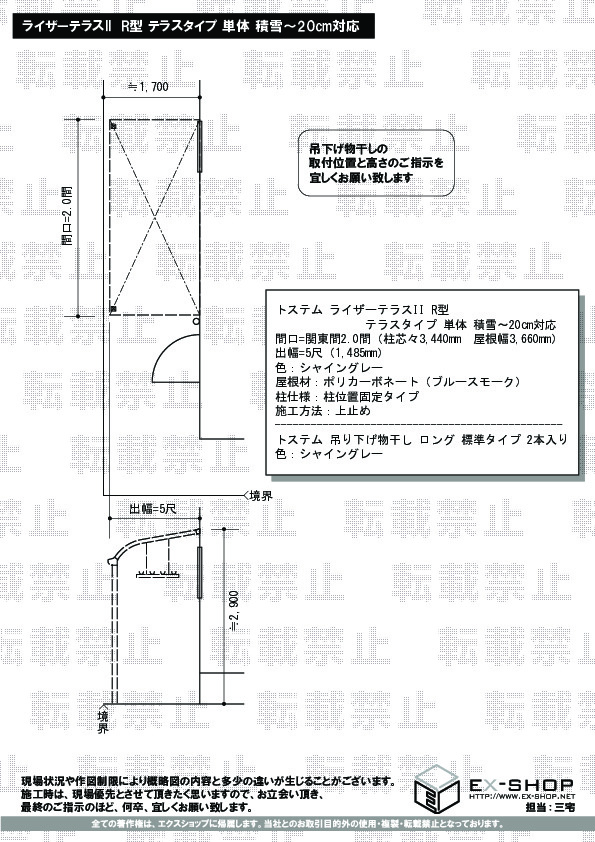 | サイズ | 屋根幅 3,660mm 出幅 1,485mm |