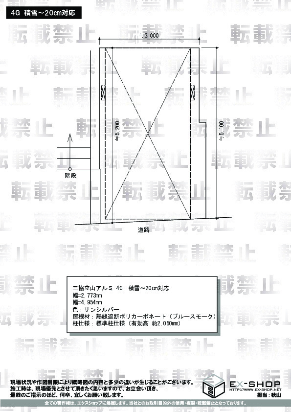 顔のみえないネット販売にはご不安がおありだったかと存じますが、弊社を信頼して、施工までお任せ頂いたことを誠に嬉しく存じます。カーポートの後方のみに柱のございます新しい形の三協立山社の4Gが、お客様の敷地に綺麗に納まりましたこと、誠に嬉しく存じます。お車の出し入れに柱が邪魔にならず、快適にご利用頂いているものと存じます。今後も、常に、お客様のご希望にかなった完成を目指し、努力して参ります。また機会がございましたら、是非エクスショップにご用命くださいますよう、宜しくお願い致します。