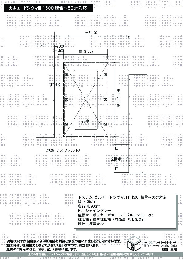 頑丈な四本の柱に支えられ、抜群の安定感を誇りますカルエードシグマIII 1500が、お客様の敷地に綺麗に納まりましたこと、大変嬉しく存じます。顔のみえないネット販売で、しかも高額の商品ともなれば、ご不安に思われるのもごもっともでございます。にもかかわらず、弊社を信頼して、施工までお任せ下さり、誠に光栄でございます。施工日数につきましては、出来るだけ正確にお伝えできますよう、施工士との連携を深めて参りたいと存じます。貴重なご意見をお寄せ頂き、誠に有難うございます。また機会がございましたら、是非エクスショップにご用命くださいますよう、宜しくお願い致します。