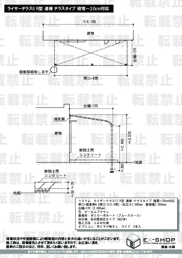サイズ | 屋根幅 7,300mm 出幅 2,085mm |