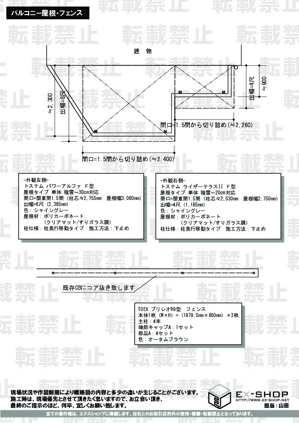 この度は、バルコニー屋根を二点と、フェンスの施工をご依頼頂きまして、誠に有難うございます。透明度の高い、ポリカーボネート(クリアマット/すりガラス調)の屋根材のご利用で、明るく、高級感のあるバルコニー屋根が完成致しましたこと、大変嬉しく存じます。お部屋の中の明るさも損なわず、快適にご利用頂けるものと存じます。落ち着いたお色のプリレオR9型フェンスも違和感のない、納まり具合でございますね。『大変満足』とのお言葉を頂き、誠に光栄に存じます。これからも、お客様のご期待を裏切らないよう精進して参りますので、また機会がございましたら、ぜひエクスショップをご利用頂けますよう、宜しくお願い致します。