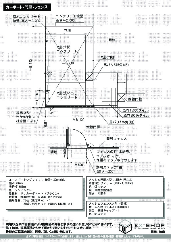 この度は、ルーフポートシグマIIIと、門扉・フェンスの施工をご依頼頂きまして、誠に有難うございます。弊社では、常にお客様にご満足頂けることを目標としておりますので、ご希望に沿った施工となりましたこと、大変嬉しく存じます。経験豊かな施工士ならではの、素敵な納まり具合でございますね。今後も変わらず、お客様のご満足の為に精進して参りたいと存じますので、また何かございましたらご遠慮なくエクスショップまでご連絡ください。この度のご利用、誠に有難うございました。