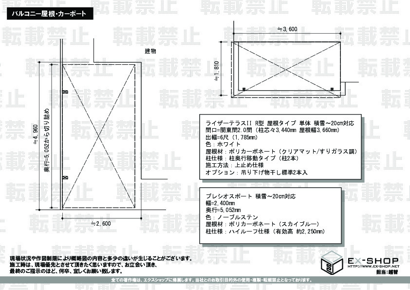 サイズ | 屋根幅 3,660mm 出幅 1,785mm |