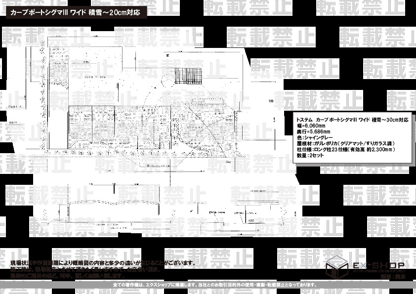 幅=3,624mm 奥行=5,686mm 色:シャイングレー 屋根材:ポリカーボネート(クリアブラウン) 柱仕様:標準柱仕様(有効高 約2,200mm)
