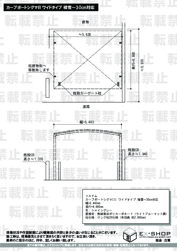 幅=3,624mm 奥行=5,686mm 色:シャイングレー 屋根材:ポリカーボネート(クリアブラウン) 柱仕様:標準柱仕様(有効高 約2,200mm)