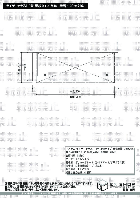 サイズ | 屋根幅 3,660mm 出幅 885mm |