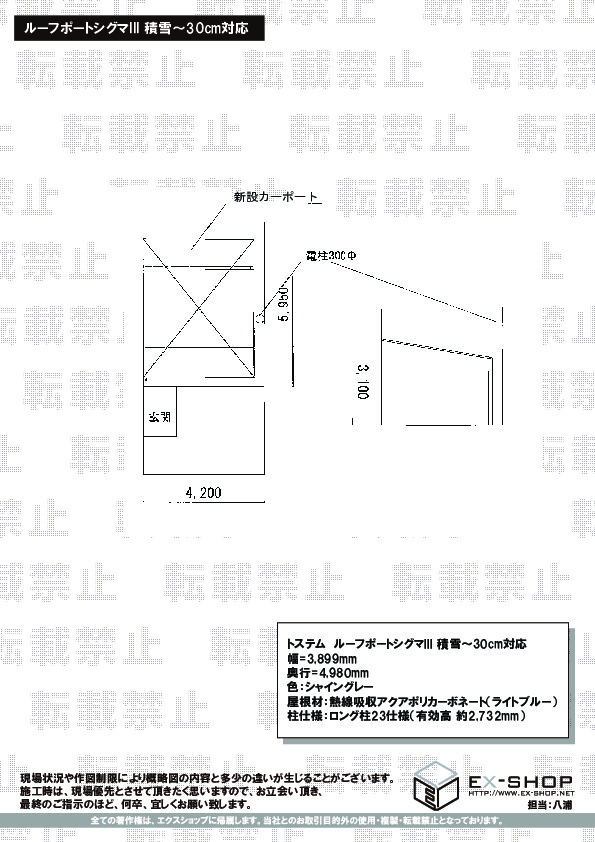この度は、ルーフポートシグマIIIの施工をご依頼頂きまして、誠に有り難うございます。デッドスペースのない、すっきりとしたお仕上がりでございますね。お気に召して頂き、何よりも嬉しく存じます。施工位置につきましては、現場調査のうえ決定致しておりますが、万が一不都合がございましたらエクスショップまでご連絡頂きますよう、宜しくお願い致します。この度のご利用、誠に有り難うございました。