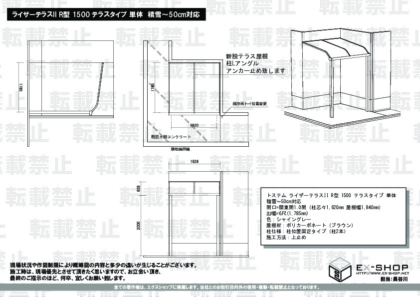 ライザーテラスII R型 1500 テラスタイプの施工をご依頼頂きまして、誠に有難うございます。弊社対応に、高い評価を頂き、誠に光栄に存じます。ご依頼頂きましたテラス屋根は、積雪50cmまで対応しておりますので、雪の多い地域にお住まいお客様にも安心してご利用頂けるものと存じます。これからも、お客様のご期待を裏切らないよう精進して参りますので、また機会がございましたら、ぜひエクスショップをご利用頂けますよう、宜しくお願い致します。