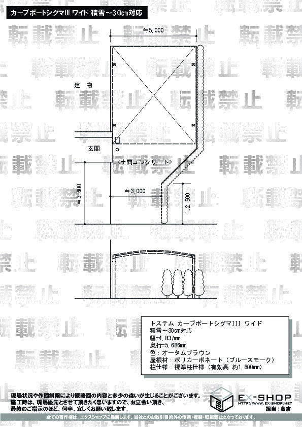 幅=3,624mm 奥行=5,686mm 色:シャイングレー 屋根材:ポリカーボネート(クリアブラウン) 柱仕様:標準柱仕様(有効高 約2,200mm)