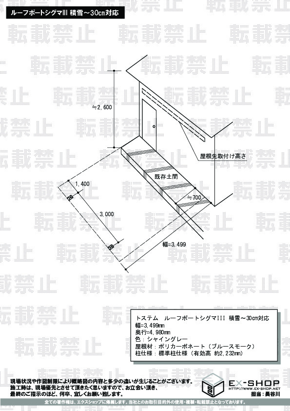 壁付けタイプのカーポートでありますルーフポートシグマIIIが、車庫の軒下に綺麗に納まりましたこと、大変嬉しく存じます。デッドスペースがなく、お客様の敷地を有効にご活用して頂けるものと存じます。また、シャイングレーのお色も既存の車庫としっくり調和して、違和感のない納まり具合でございますね。これからも、お客様のご期待を裏切らないよう精進して参りますので、また機会がございましたら、ぜひエクスショップをご利用頂けますよう、宜しくお願い致します。