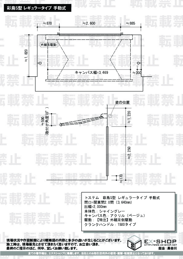 彩鳥S型 レギュラータイプの施工をご依頼頂きまして、誠に有難うございます。ご自宅の白を基調とした外観に、ベージュのキャンバス地がよく映えた、大変素敵なお仕上がりでございますね。この度は弊社の確認不足により、お客様にご迷惑をおかけしてしまいましたこと、謹んでお詫び申し上げます。この度のことを真摯に受けとめ、今後このような確認不足がないよう、全スタッフに徹底して申し伝えて参ります。このような至らぬ点があったにも関わらず、施工・商品にご満足頂けたとのお言葉、大変嬉しく思います。今後、お客様の期待を裏切ることのないよう、精一杯努めて参りますので、また機会がございましたら、是非エクスショップにご用命くださいますよう、宜しくお願い致します。