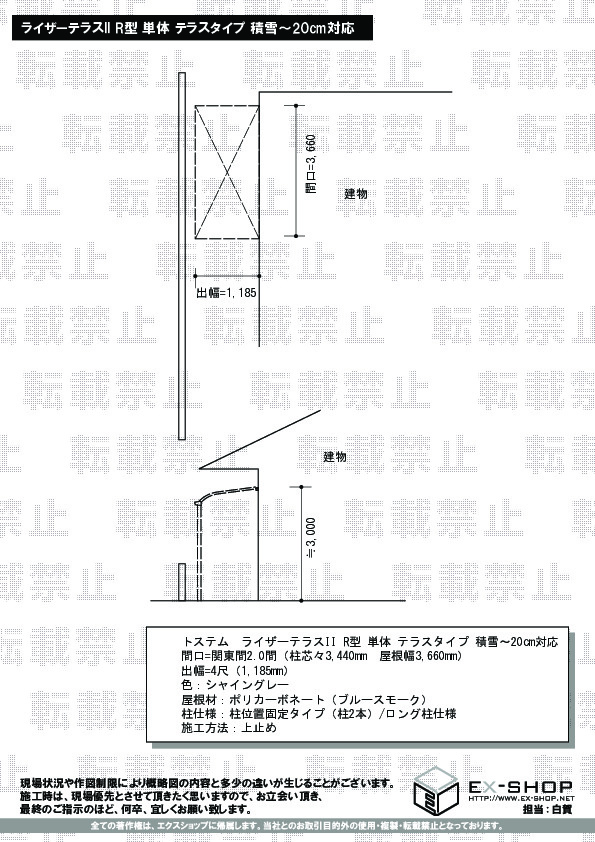 | サイズ | 屋根幅 3,660mm 出幅 1,185mm |