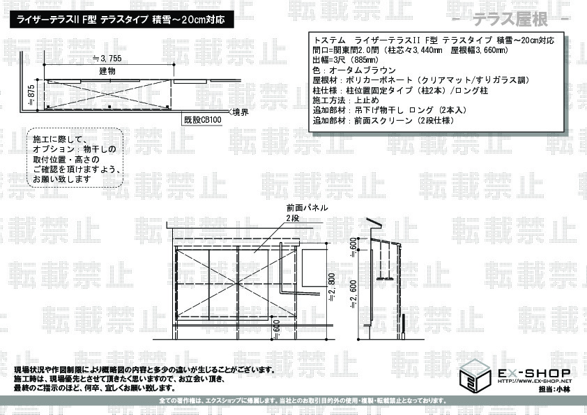 | サイズ | 屋根幅 3,660mm 出幅 885mm |