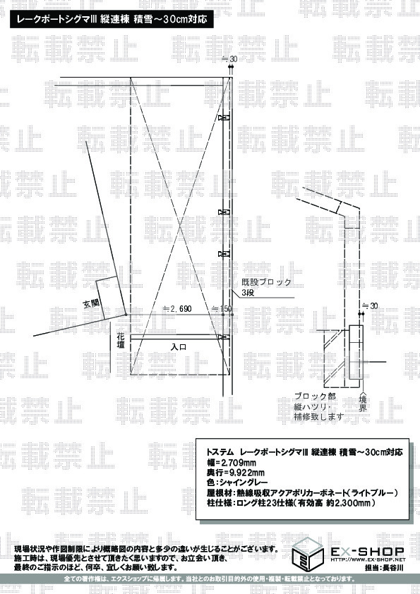 今回2回目の注文で、不安も無く工事が完了したと思います。これから、降灰、雨、日よけとして大活躍です。1点だけ残念だったことは、設置場所を大幅に違う場所に設置しそうになったことです。エクスショップからの図面もこちらの要望通りになっていました。どこで食い違ったのか分かりませんが、始めの段階で分かったので修正してもらいました。
