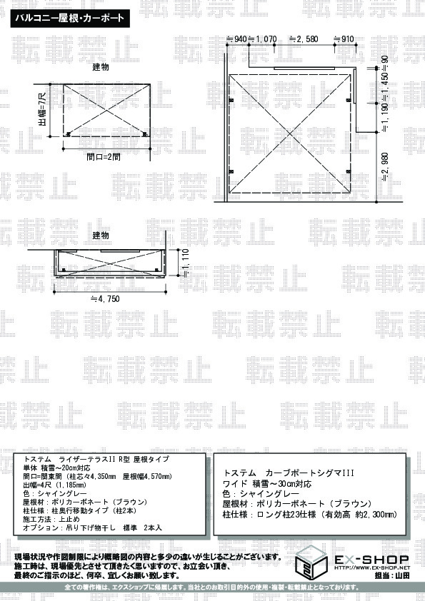 サイズ | 屋根幅 4,570mm 出幅 1,185mm |