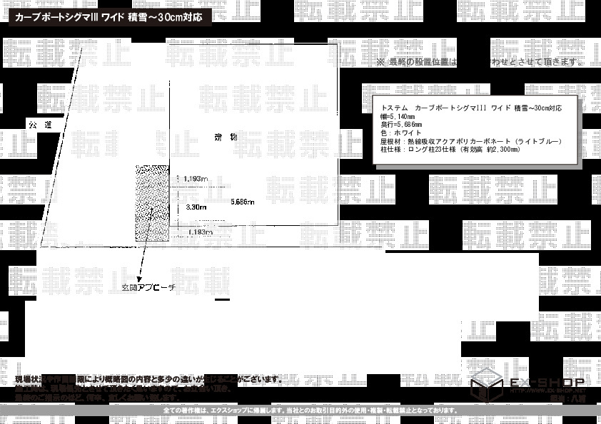 幅=3,624mm 奥行=5,686mm 色:シャイングレー 屋根材:ポリカーボネート(クリアブラウン) 柱仕様:標準柱仕様(有効高 約2,200mm)