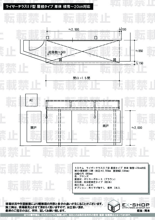 サイズ | 屋根幅 2,530mm 出幅 885mm |