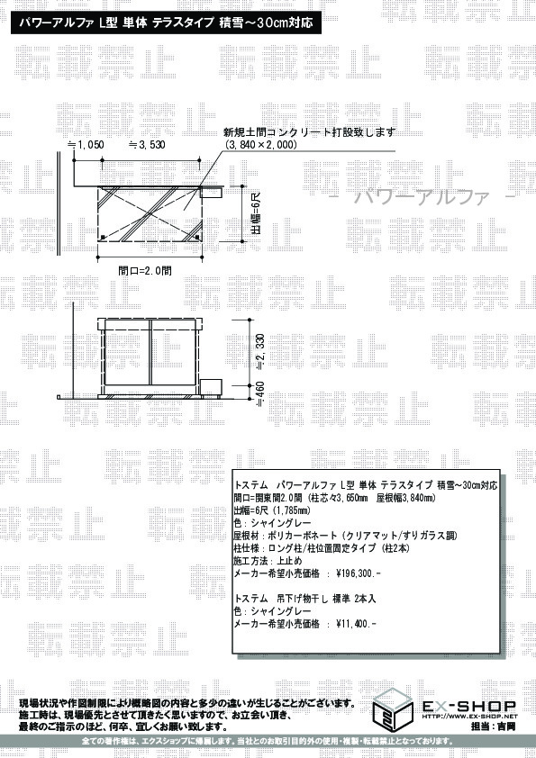 サイズ | 屋根幅 3,840mm 出幅 1,785mm |