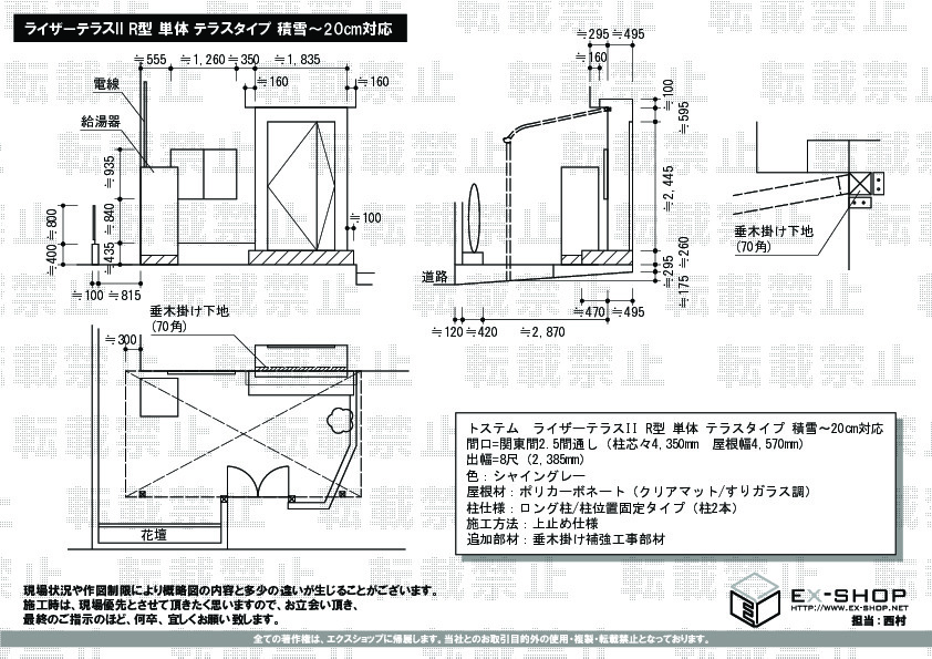サイズ | 屋根幅 4,570mm 出幅 2,385mm |