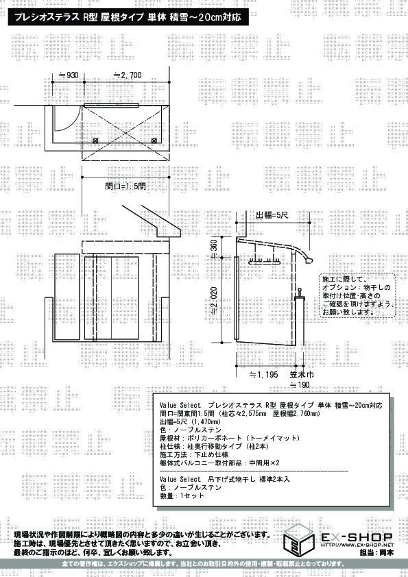 | サイズ | 屋根幅 2,760mm 出幅 1,470mm |