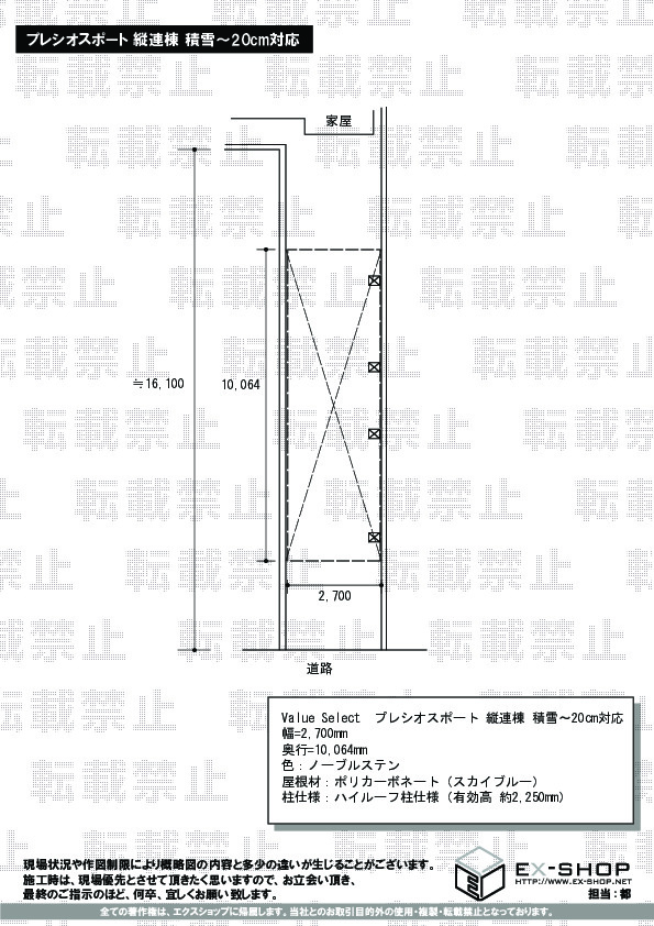 プレシオスポート 縦連棟タイプの、スマートな立ち姿が大変美しいですね。納期、施工内容にご満足頂き、大変嬉しく存じます。つっかえ棒の撤去が遅れ、申し訳ございませんでした。今後も丁寧で迅速な対応を心掛け、更にお客様に満足して頂けるエクスショップを目指して参ります。この度のご利用、誠に有り難うございました。