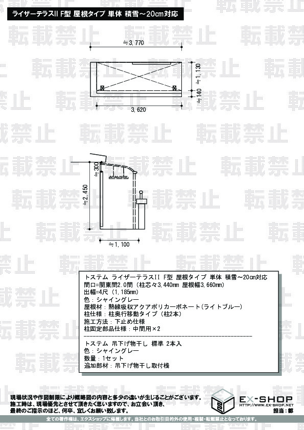 | サイズ | 屋根幅 3,660mm 出幅 1,185mm |