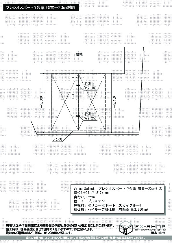 プレシオスポート アール型 Y合掌セット 2台用は2台のプレシオスポート アール型 1台用の柱を中央に集約させた、エクスショップオリジナルブランドのY字型カーポートです。基準風速Vo=34m/sの耐風性能・20cm相当(600N/㎡)の耐積雪性能をもっています。
