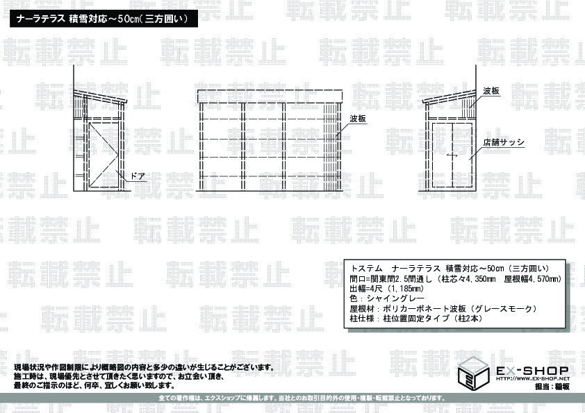 | サイズ | 屋根幅 4,570mm 出幅 1,185mm |