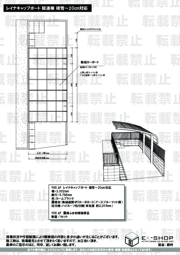 お客様のお住まいの地域に密着した施工担当者ならではの、親身な対応にご満足頂き、大変嬉しく存じます。柱側に伸びた屋根材が、雨風の吹き込みを防ぎますレイナキャップポート 縦連棟タイプが、綺麗に納まり、私どもも安堵致しました。ポリカーボネート(トーメイマット/すりガラス調)の屋根材が、光を通し、明るいお仕上がりでございますね。これからも、お客様のご期待を裏切らないよう精進して参りますので、また機会がございましたら、是非エクスショップをご利用頂けますよう、宜しくお願い致します。