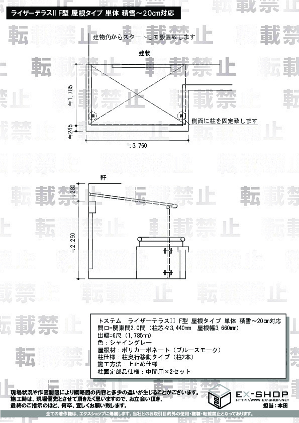 | サイズ | 屋根幅 3,660mm 出幅 1,785mm |
