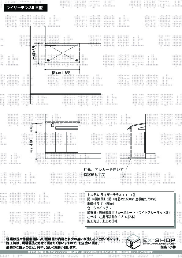| サイズ | 屋根幅 2,750mm 出幅 1,485mm |