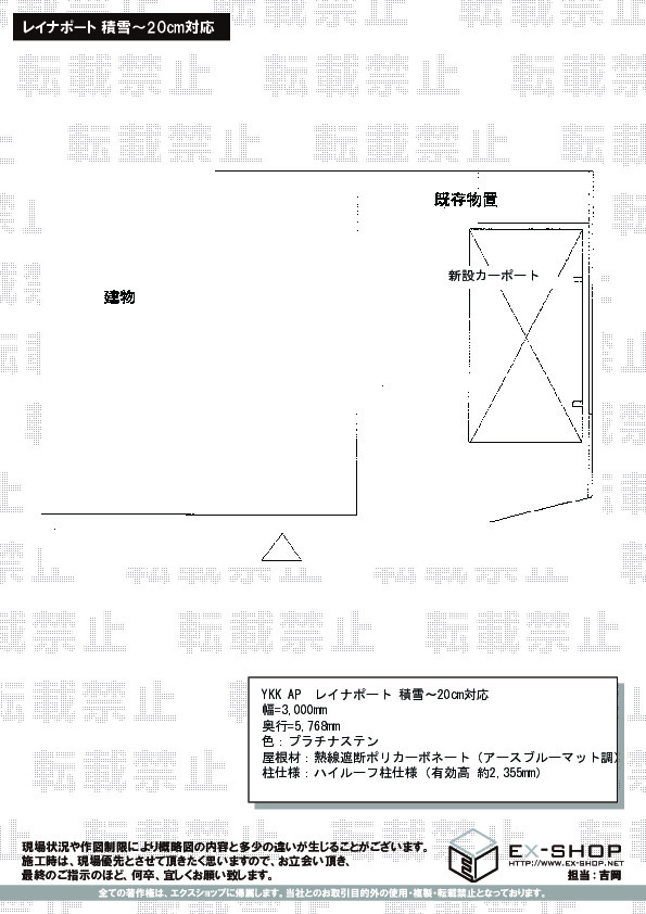 施工を伴います商品を、顔の見えないネットショッピングでご依頼頂くにあたりましては、ご不安に思われることも多かったかと存じますが、弊社を信頼してご用命くださり、誠に有り難うございます。お客様より頂きます施工例は、私どもにとりましてまさに宝物のような存在でございます。ご参考にしてご依頼頂き、また、レイナポートもお客様のご希望通りに納まりましたこと、大変嬉しく存じます。これからも、エクスショップをご利用頂いた皆様に笑顔の輪が広がりますよう、一層の努力を重ねて参りたいと存じます。この度のご利用、誠に有り難うございました。