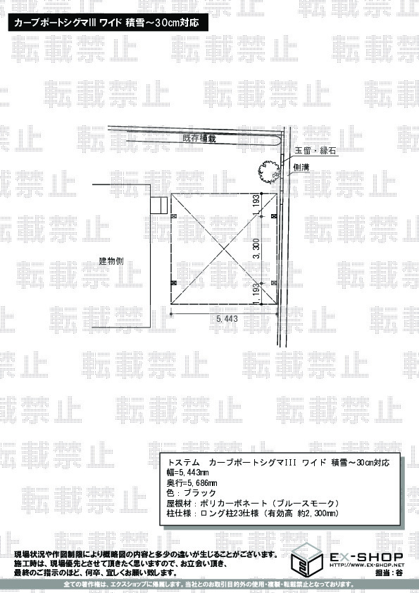 幅=3,624mm 奥行=5,686mm 色:シャイングレー 屋根材:ポリカーボネート(クリアブラウン) 柱仕様:標準柱仕様(有効高 約2,200mm)