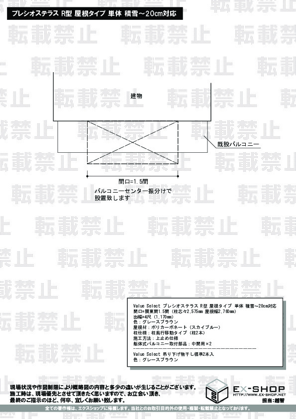 この度は、プレシオステラス R型の施工をご依頼頂きまして、誠に光栄に存じます。現場調査のご依頼を頂いてから、バルコニー屋根の施工が完了するまで、全てにおいてご満足頂き大変嬉しく存じます。お手頃な価格でご提供致しておりますValue Selectシリーズでございますが、一流メーカー品と遜色ない品質をお約束致しておりますので、安心してご使用頂けるものと存じます。今後も変わらず、お客様のご満足の為に精進して参りたいと存じますので、また何かございましたら、お気軽にエクスショップまでご連絡ください。
