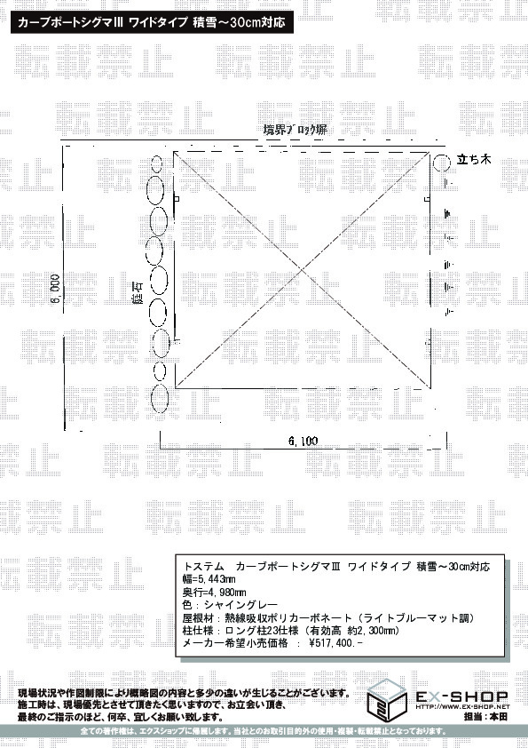 屋根材等 | 熱線吸収ポリカーボネート(ライトブルーマット調) 柱仕様:ロング柱23仕様(有効高 約2,300mm) |