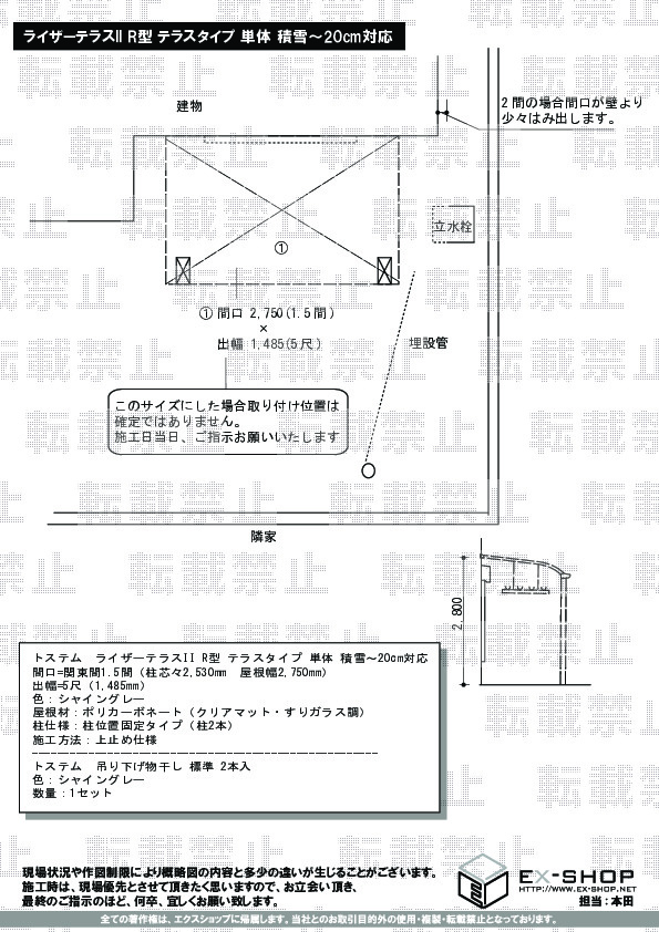 サイズ | 屋根幅 2,750mm 出幅 1,485mm |