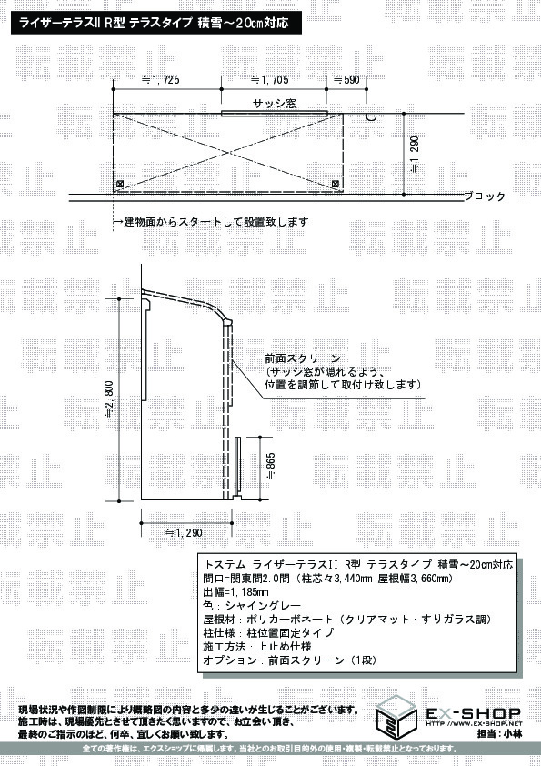 サイズ | 屋根幅 3,660mm 出幅 1,185mm |