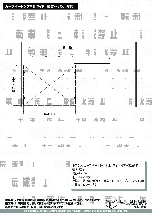 幅=3,624mm 奥行=5,686mm 色:シャイングレー 屋根材:ポリカーボネート(クリアブラウン) 柱仕様:標準柱仕様(有効高 約2,200mm)