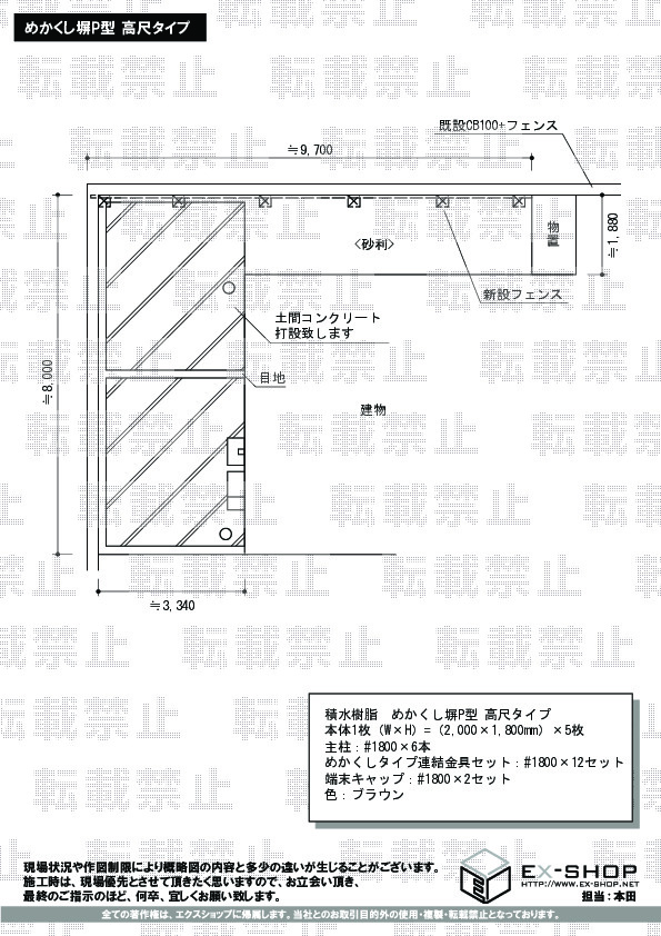 この度は、めかくし塀P型 高尺タイプの施工ご依頼を頂き誠に有難うございます。弊社ホームページのお見積りシステムをご活用頂き、快適にご利用頂けましたこと、大変嬉しく存じます。ブラウンの落ち着いた雰囲気と、しっかりと敷地をガードし目隠し効果もあるとても素敵なお仕上がりでございますね。施工士の協力の元、ご満足頂けるお仕上がりとなり大変嬉しく存じます。今後も、お客様にご満足頂ける様、日々精進して参りますのでまた機会がございましたら是非エクスショップをご利用下さいます様、宜しくお願い致します。