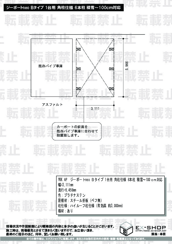 この度は、ジーポートの施工ご依頼を頂き誠に有難うございます。ハイルーフ柱仕様ですっきりとしており、ますが積雪から100cmも対応可能でございますので、快適にご利用頂けるものと存じます。お喜びいただくことが出来、私どもも大変嬉しく存じます。今後も、お客様にご満足頂ける様、日々精進して参りますのでまた機会がございましたら是非エクスショップをご利用下さいます様、宜しくお願い致します。
