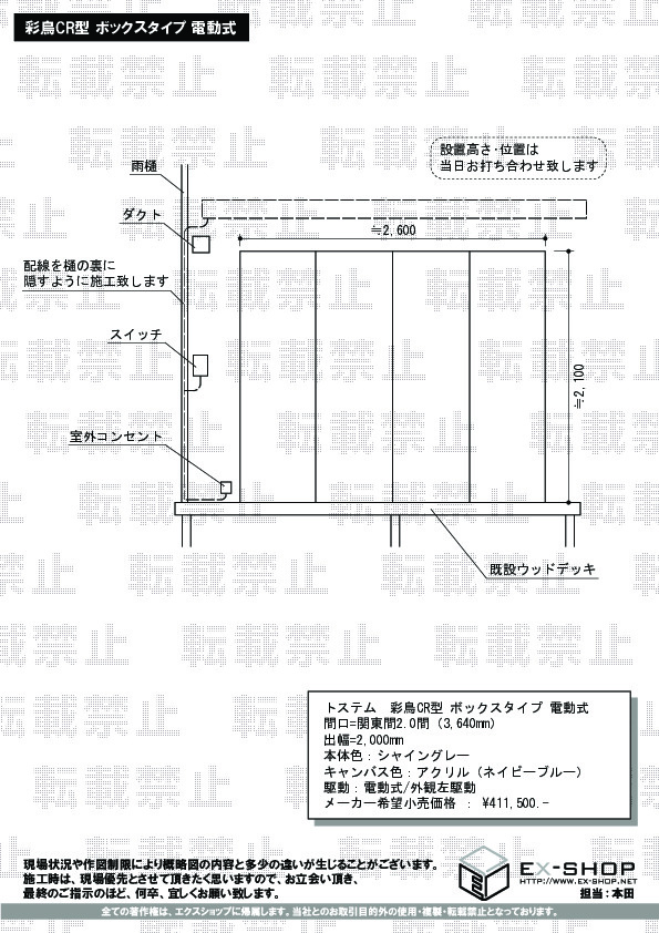 再度エクスショップをご利用頂きまして、誠に有り難うございます。彩鳥CR型 ボックスタイプを、格安のお値段でご提供することが出来、施工内容にもご満足頂きましたこと、大変嬉しく存じます。前面ロールスクリーンにより日差しが遮断された既存のウッドデッキが快適な空間となり、お喜び頂いているものと存じます。商品の詳細につきましては、出来る限り事前に詳しくご説明が出来ますよう、社内教育の充実に努めて参りたいと存じます。この度のご利用、誠に有り難うございました。またのご利用、心よりお待ち申し上げております。