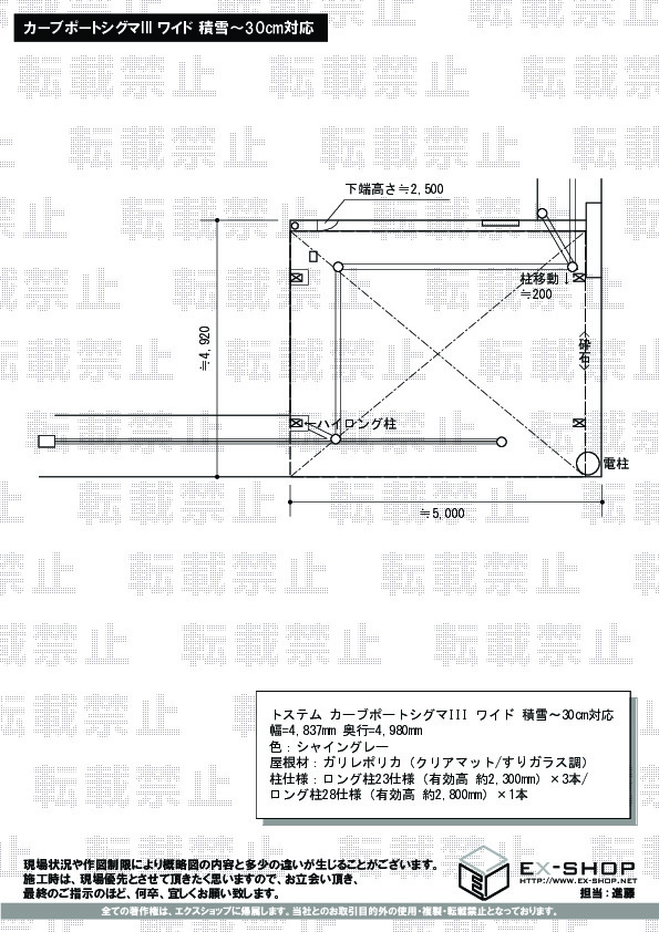 屋根高等 | ロング柱23仕様(有効高 約2,300mm)×3本/ロング柱28仕様(有効高 約2,800mm)×1本 |