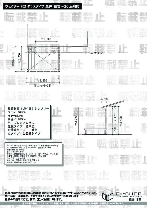 サイズ | 屋根幅 3,670mm 出幅 2,970mm |